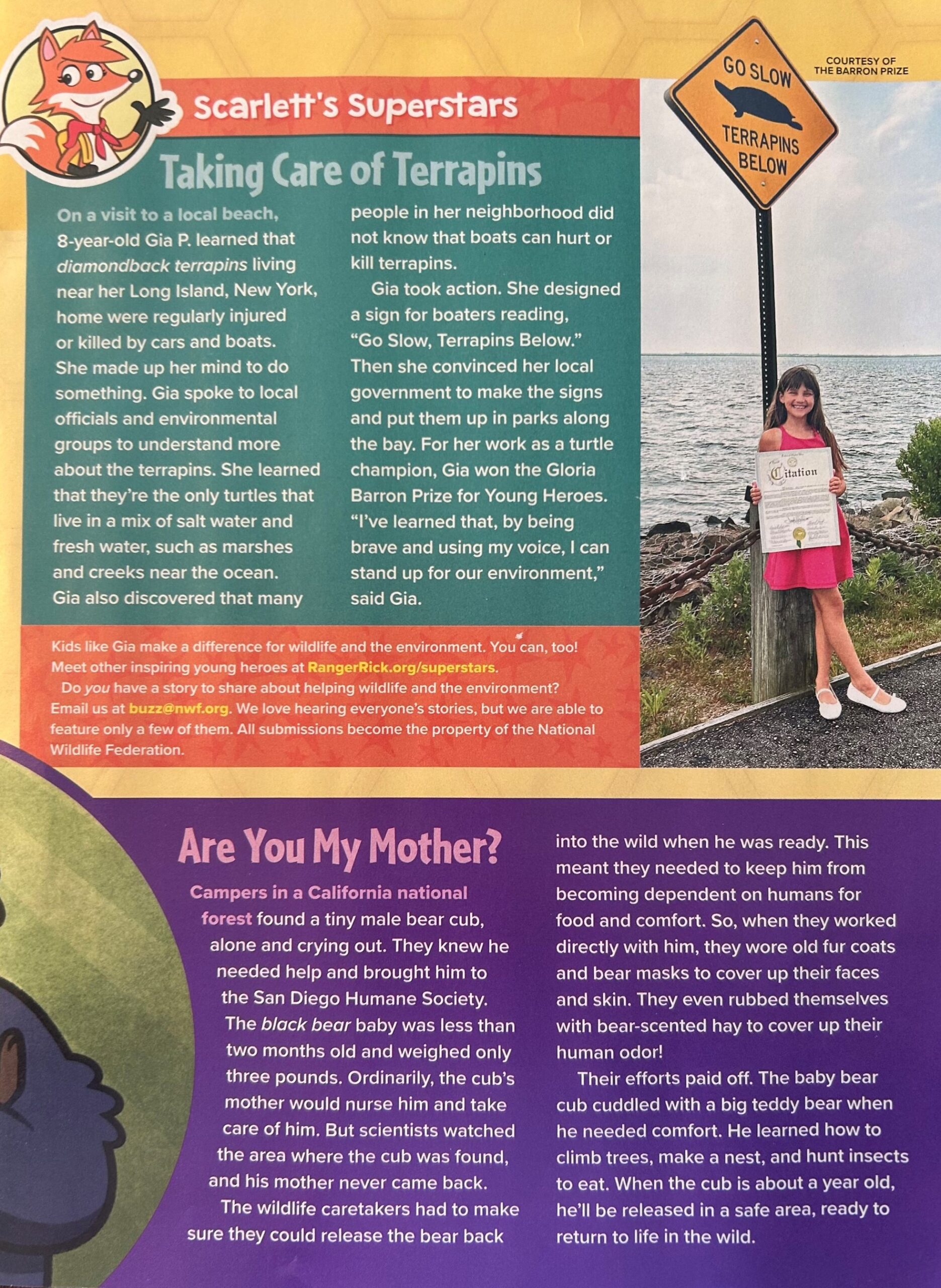 Gia was inspired to help the turtles after a trip to the North Shore of Long Island, where she noticed signs along the beach about terrapins and their nesting areas. She began watching the waters near her home and noticed terrapins there, too — in the canals and on the surface of the bay. Concerned that many of her boating neighbors didn’t know about the terrapins, Gia reached out to local nonprofits Friends of the Bay and Seatuck about the most effective ways to raise awareness. She learned from these groups that informational signs similar to the ones she’d seen on the North Shore can be hugely helpful. Gia set to work designing signs and asked the Town Board to consider making and installing them. Her signs will soon be placed in two local bayfront parks and she will be honored for her efforts at a Town Board meeting. “I’ve learned that by being brave and using my voice, I can stand up for our environment,” says Gia. “I hope my story inspires other kids to be brave and to know they can make a difference!”